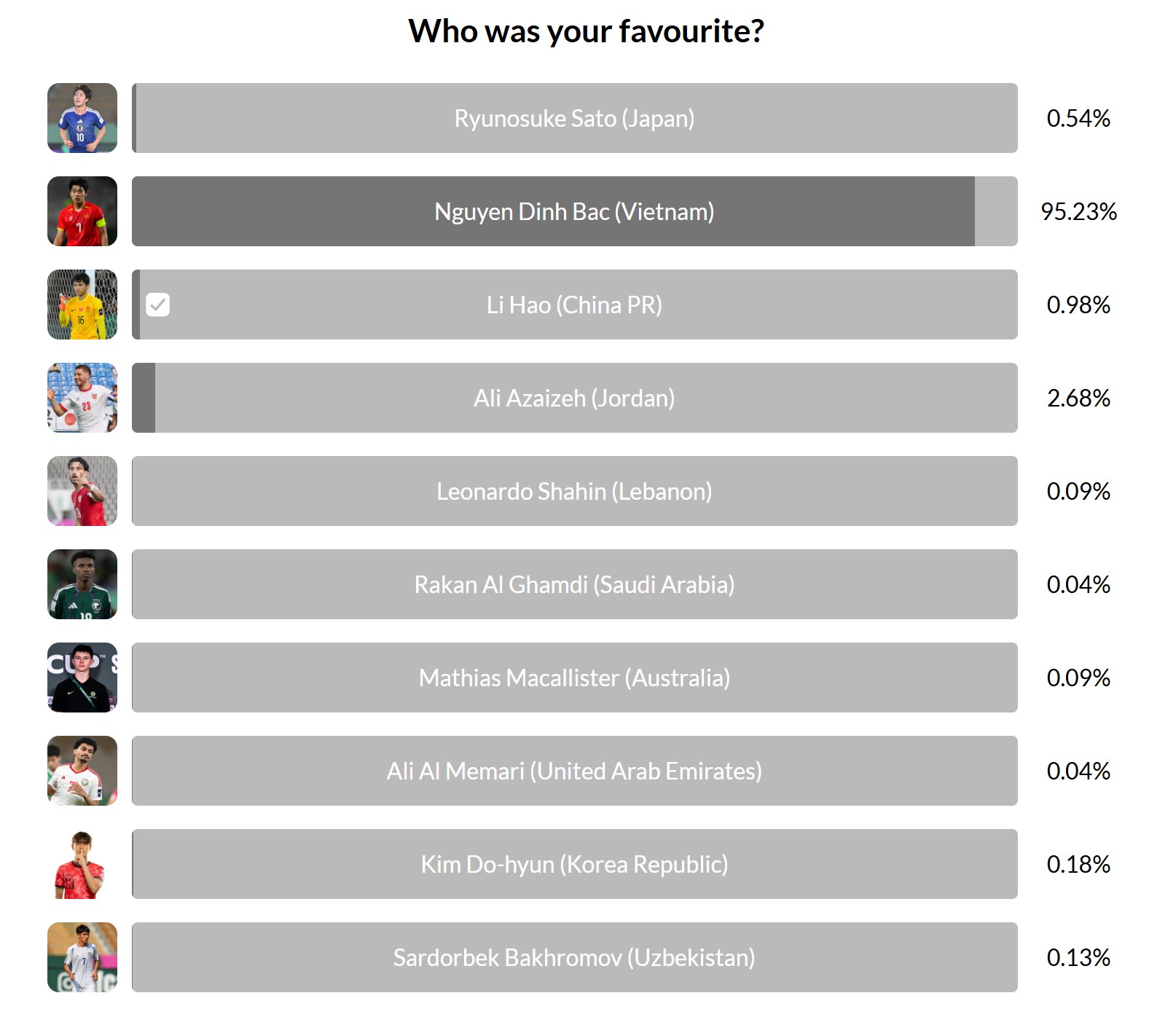 近日,亚足联官方发布了2026年U23亚洲杯最具影响力球员评选。其中,本届赛事表现神勇的中国U23门将李昊入选。值得一提的是,本届赛事中随队获得季军的越南队球员阮庭北在球迷投票中大幅领先所有其他球员,截至目前获得了95.23%的选票占比。本届赛事MVP佐藤龙之介仅获得球迷0.54%选票。中国U23门将李昊获得0.98%选票。