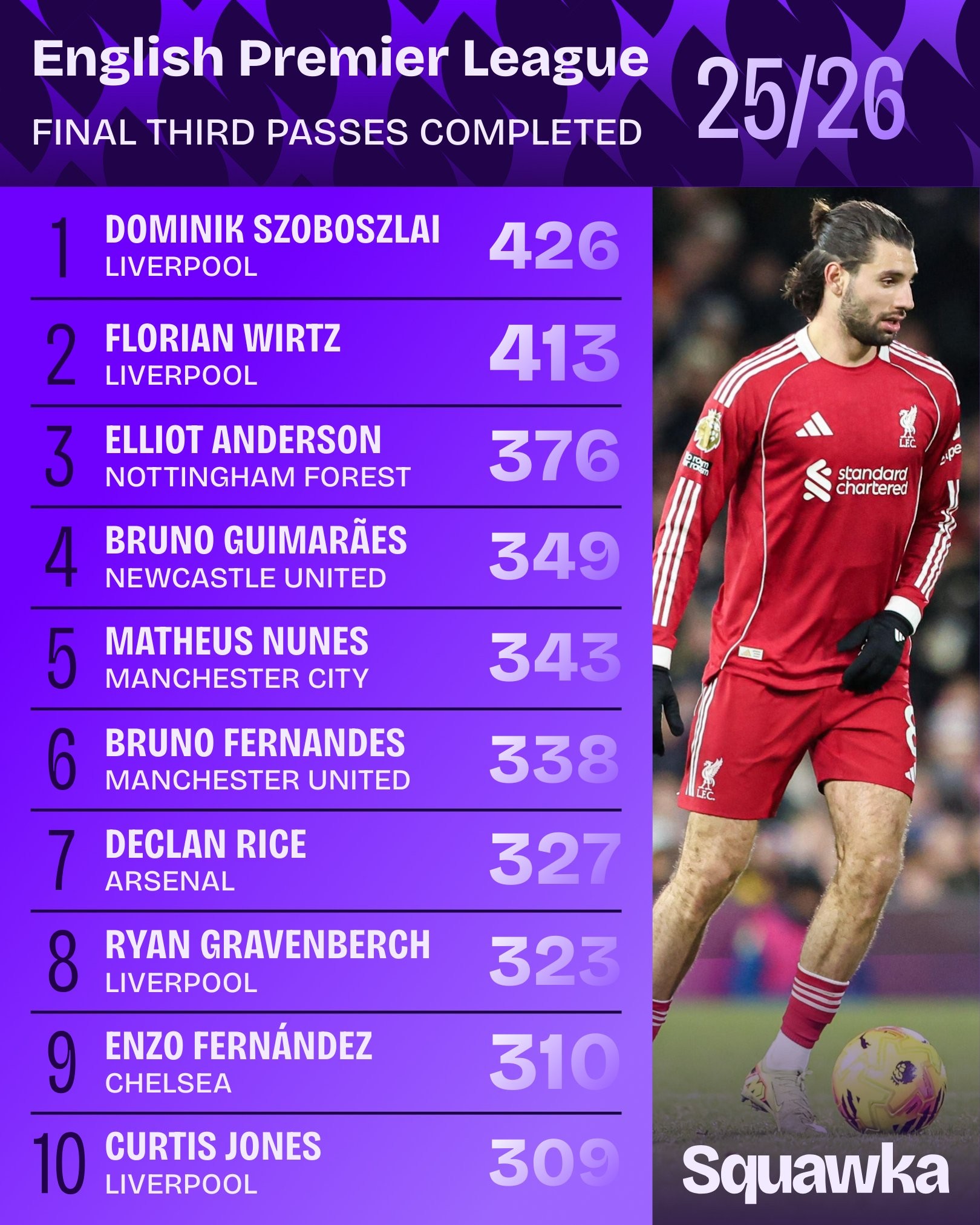 周三,知名数据机构Squawka统计了本赛季英超进攻三区成功传球数据,索博斯洛伊、维尔茨位列前二,利物浦有4人进榜单前十名。