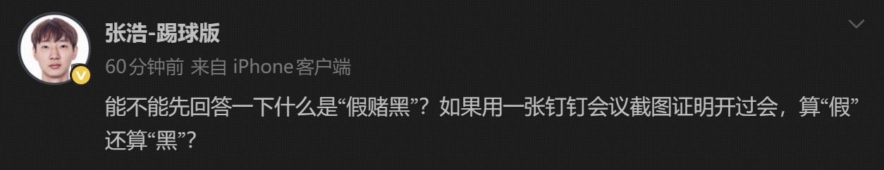 获悉此消息后,曾在上海申鑫、黑龙江冰城、广东广州豹等队效力的球员张浩在社交媒体上写道:能不能先回答一下什么是“假赌黑”?如果用一张钉钉会议截图证明开过会,算“假”还算“黑”?