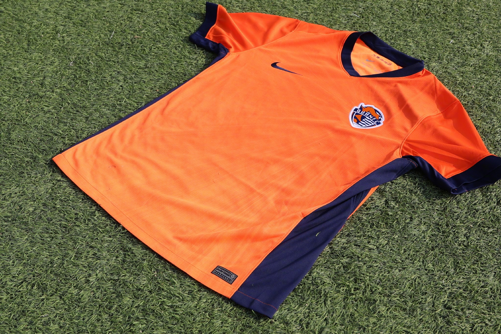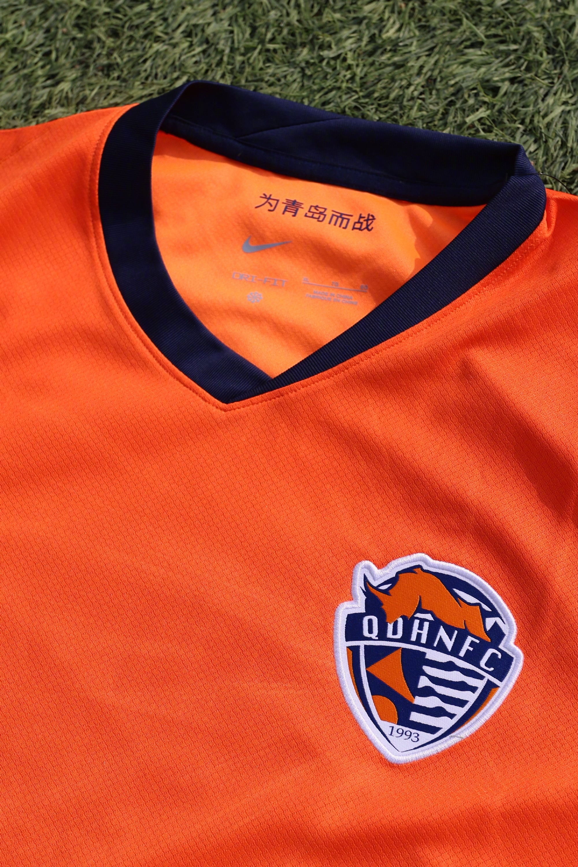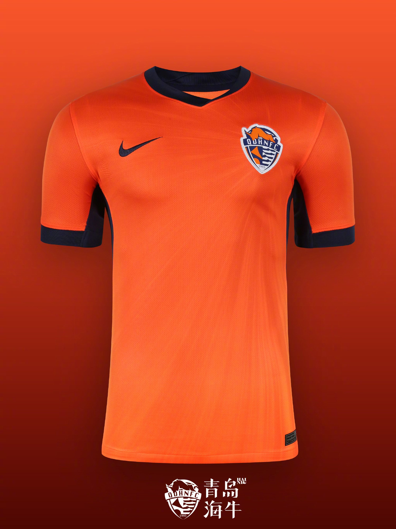 耐克官方介绍到:新赛季青岛海牛主场球衣通过由队徽向外延展的光影纹样呈现球队的速度与活力。亮橙色辅以深蓝色点缀相互呼应,使视觉层次更加清晰且富有张力。