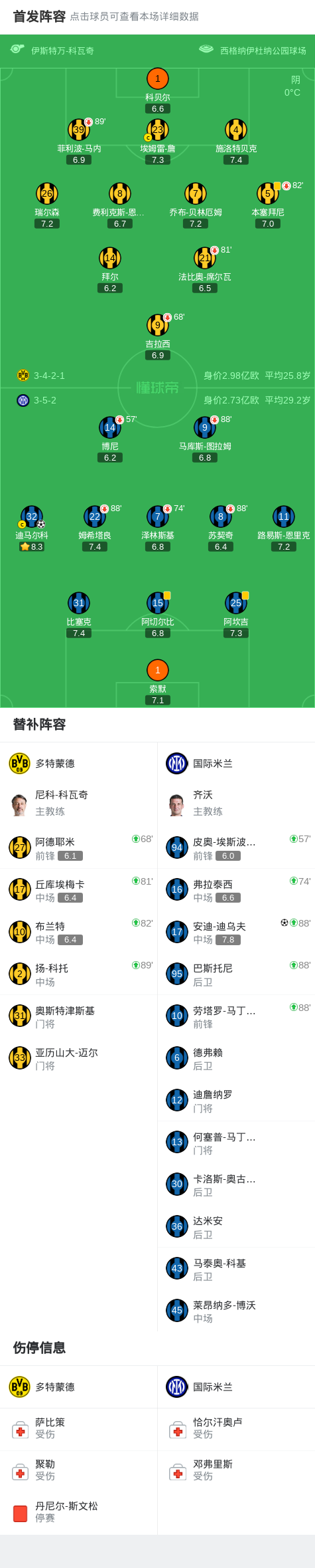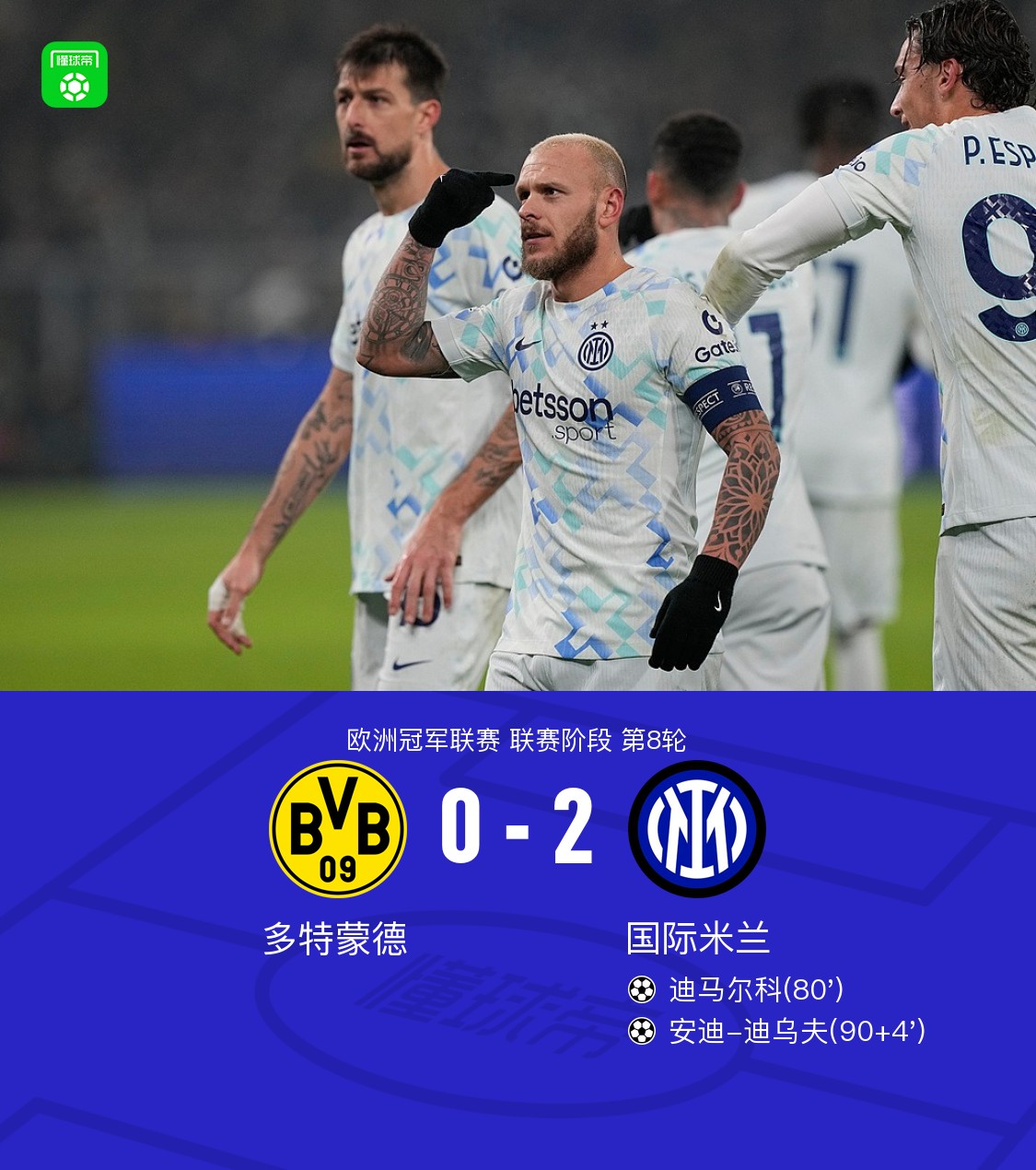 北京时间1月29日欧洲冠军联赛 联赛阶段 第8轮,多特蒙德对阵国际米兰。国际米兰迪马尔科破门,安迪-迪乌夫破门。最终比分多特蒙德 0–2 国际米兰。