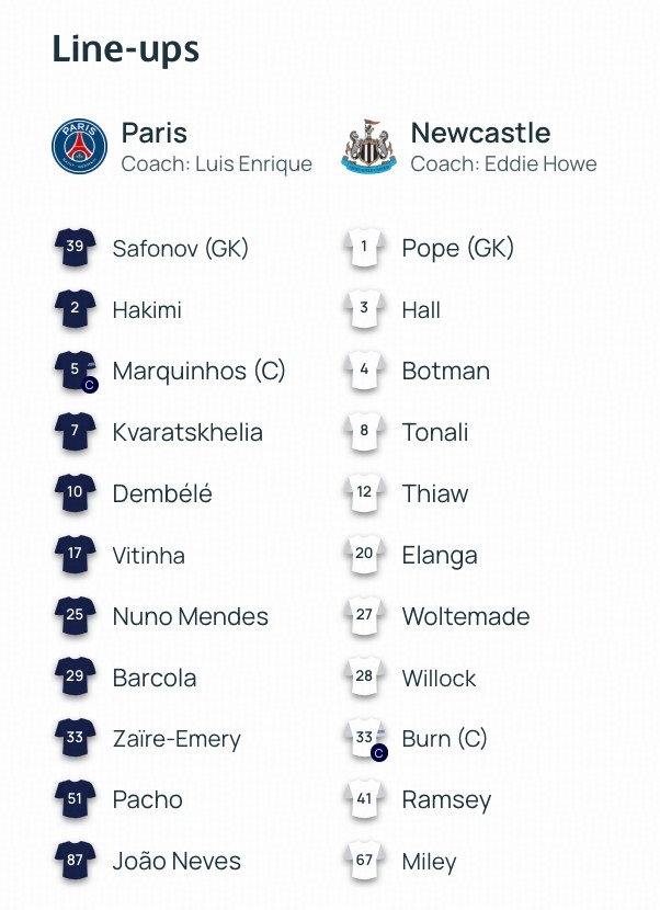 北京时间1月29日4:00,欧冠联赛阶段第8轮,巴黎主场对阵纽卡。赛前首发公布。 文章导航 记者:因续约谈判进展不顺,本泽马要求退出吉达联合比赛名单 多特vs国米:吉拉西PK小图拉姆;劳塔罗替补,博尼出战