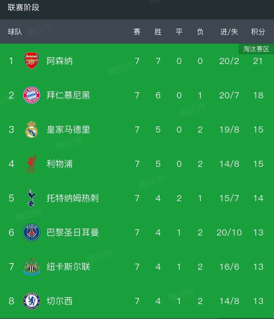 第七轮结束时,已经确定提前出线的阿森纳和拜仁排名前二,皇马和利物浦同积15分排名第三、第四,托特纳姆热刺14分第五,而巴黎、纽卡和切尔西同积13分排名六至八名。