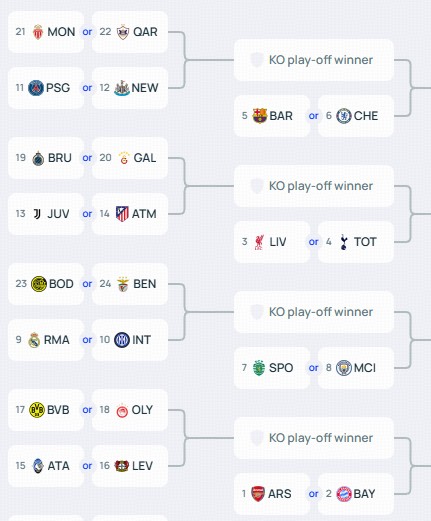 淘汰赛附加赛抽签将根据联赛阶段的排名进行分组,其中9-16名的队伍为种子队,17-24名的队伍为非种子队,种子队将在两回合比赛中先客后主。