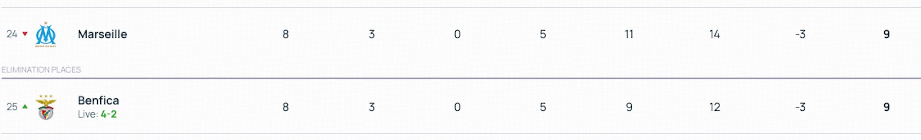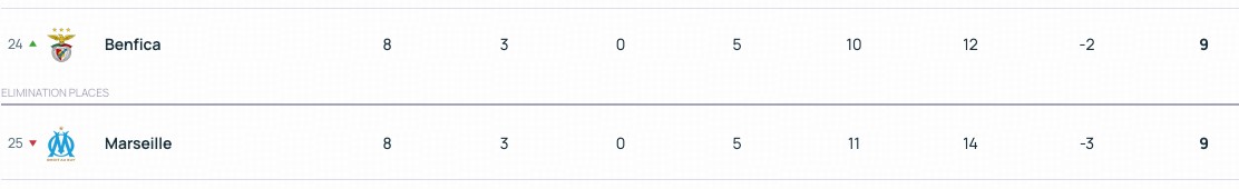 赛前,本菲卡排名第29位,出线形势危急。