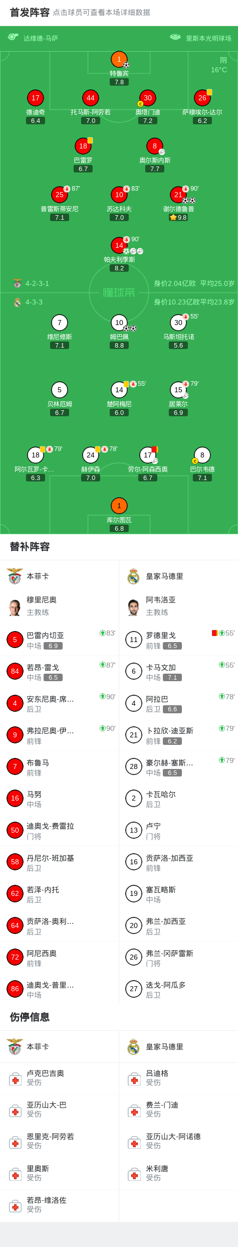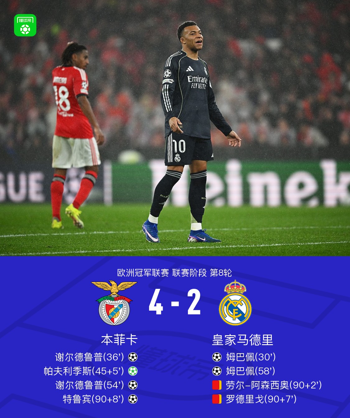 北京时间1月29日欧洲冠军联赛 联赛阶段 第8轮,本菲卡对阵皇家马德里。本菲卡谢尔德鲁普梅开二度,特鲁宾破门,帕夫利季斯破门。皇家马德里姆巴佩梅开二度。最终比分本菲卡 4–2 皇马。