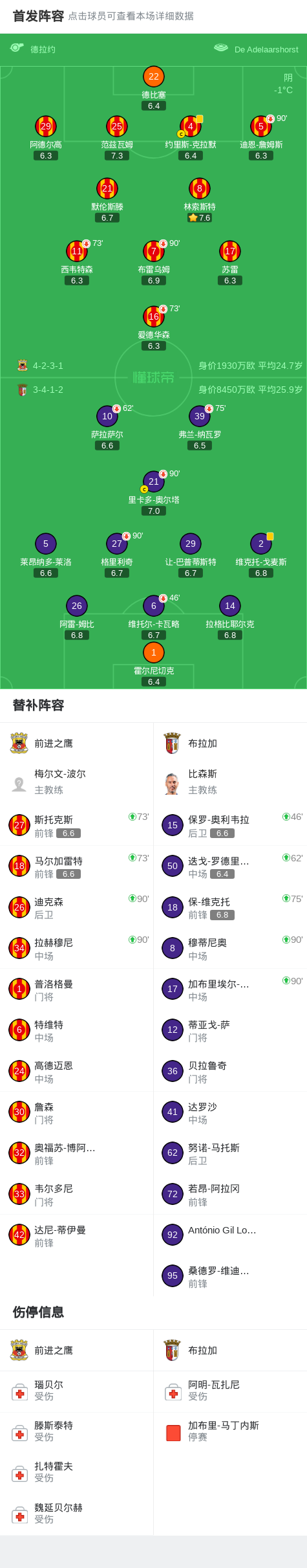 北京时间1月30日欧足联欧洲联赛 联赛阶段 第8轮,前进之鹰对阵布拉加。最终比分前进之鹰 0–0 布拉加。 点击查看本场比赛详细数据>> 点击查看欧联完整积分榜>> 球队阵容 技术统计 文章导航 亨克2-1逆转马尔默,卡雷察斯建功,埃曼斯1射1传 布加勒斯特星1-1费内巴切,于克塞克破门,齐索蒂扳平