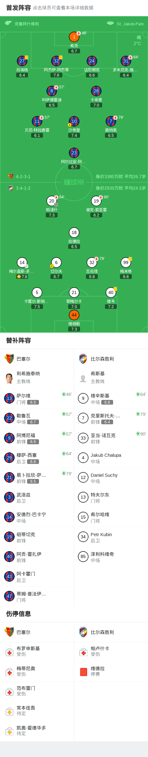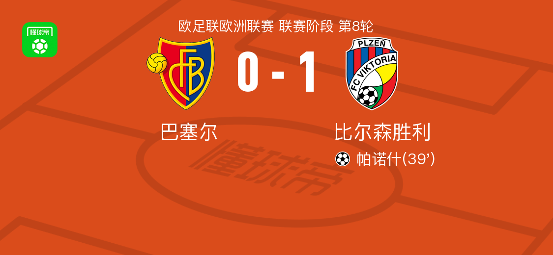 北京时间1月30日欧足联欧洲联赛 联赛阶段 第8轮,巴塞尔对阵比尔森胜利。比尔森胜利帕诺什破门。最终比分巴塞尔 0–1 比尔森胜利。 点击查看本场比赛详细数据>> 点击查看欧联完整积分榜>> 精彩瞬间 第39分钟,比尔森胜利球员梅尔查斯-多斯基助攻帕诺什打入一球。 球队阵容 技术统计 文章导航 布加勒斯特星1-1费内巴切,于克塞克破门,齐索蒂扳平 贝尔格莱德红星1-1塞尔塔,费尔-洛佩斯破门,布鲁诺-杜阿尔特救主