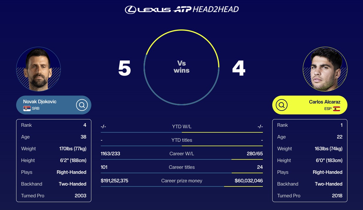 这将是二人第9次交手,此前德约5胜4负略占优势,上赛季两人曾经两次交手,其中澳网1/4决赛中,德约3-1战胜了阿尔卡拉斯,而最近一次交手出现在去年美网半决赛,当时德约0-3不敌阿尔卡拉斯。
