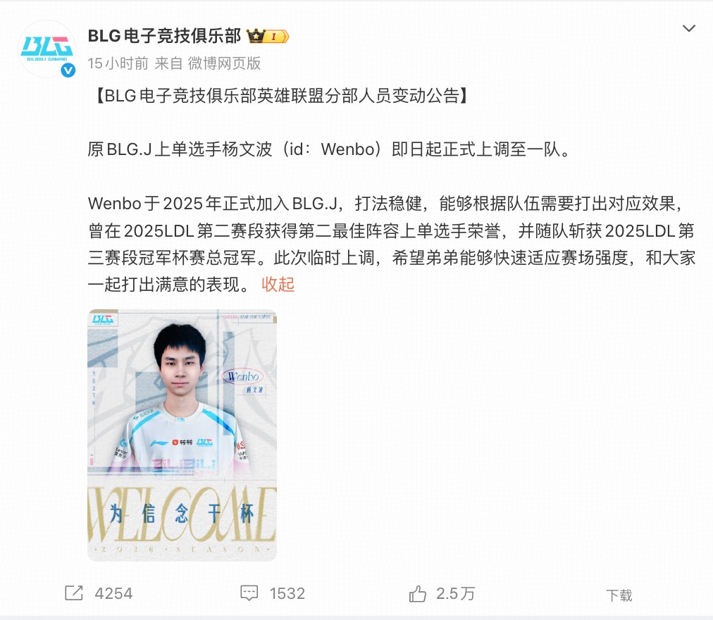 本周四,网络上爆料BLG上单陈泽彬(Bin)与队内爆发矛盾离队。不过目前来看,Bin还在BLG的比赛名单中。