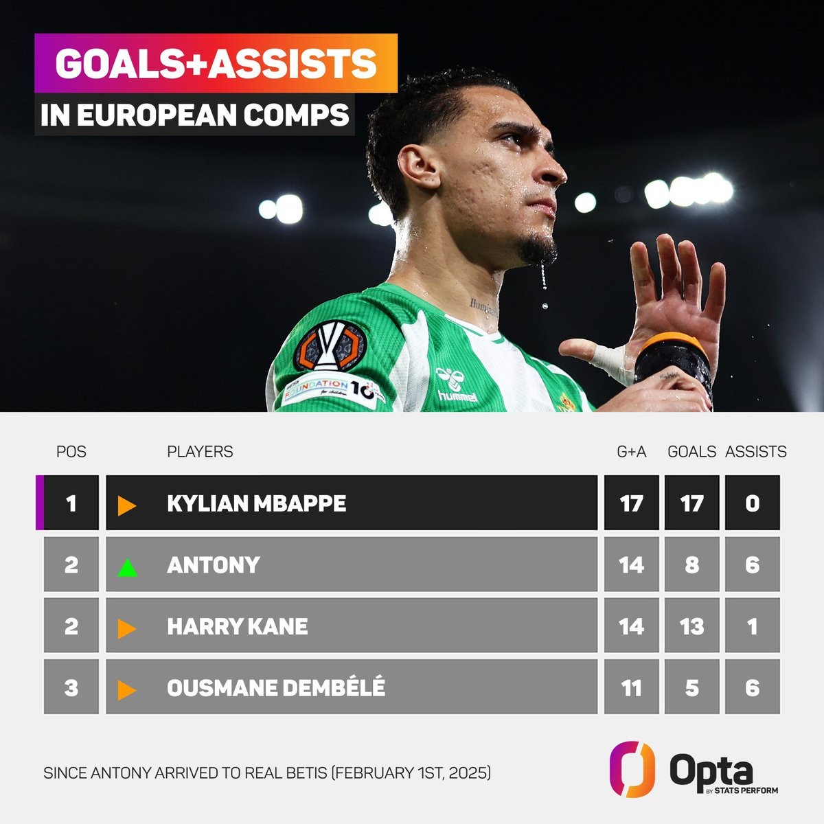 根据Opta统计,自2025年2月1日安东尼加盟贝蒂斯以来,这位巴西球星已经在欧战的比赛中直接参与了14粒进球,其中他自己打进8球并且6次助攻队友得分,同期这一数据与哈里-凯恩并列所有球员的第二位,领先于直接参与11粒欧战进球的登贝莱,仅次于制造17球的姆巴佩。