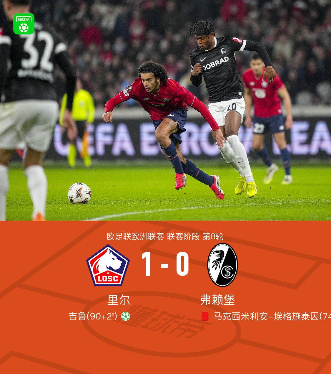 北京时间1月30日欧足联欧洲联赛 联赛阶段 第8轮,里尔对阵弗赖堡。里尔吉鲁破门。最终比分里尔 1–0 弗赖堡。