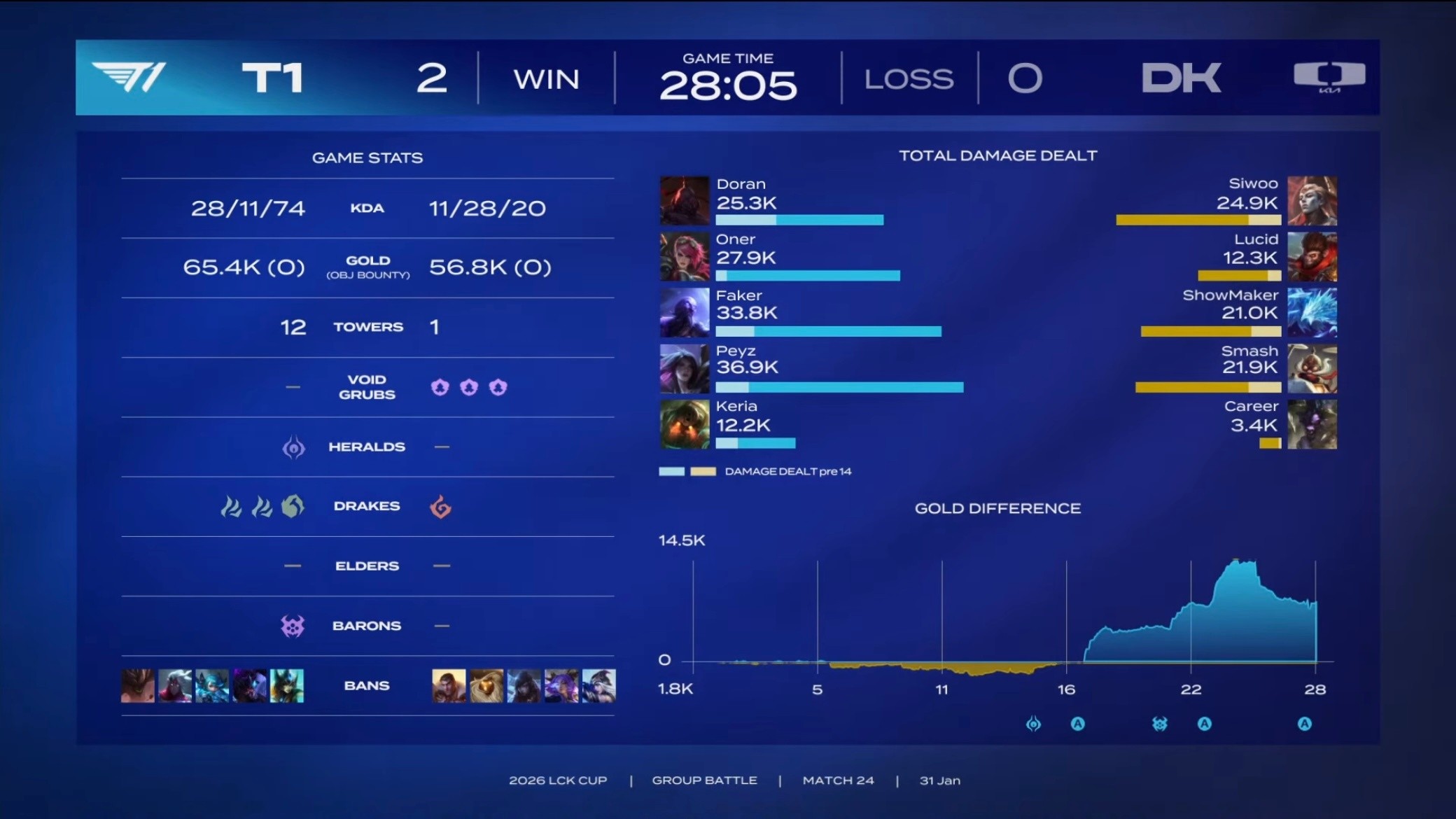 北京时间1月31日,LCK杯超级周倒数第二日,T1与DK迎来正面对决。由于此前老龙组已经拿到赛点,所以只要DK取胜,老龙组就将确定获胜。结果DK并没有展现出太多还手之力,被T1以3-0轻松取胜。至此两组回到平分,明天GEN与HLE的比赛将决定胜负。