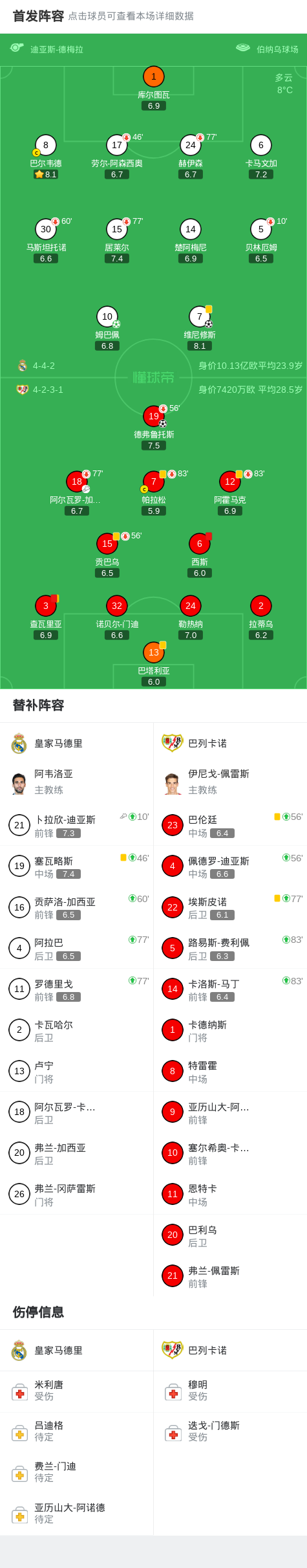 第49分钟,德弗鲁托斯左脚抽射近角破门,皇马1-1被巴列卡诺扳平!