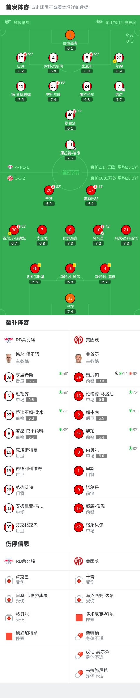 北京时间1月31日德国足球顶级联赛 联赛 第20轮,RB莱比锡主场对阵美因茨。RB莱比锡康拉德-哈德破门。美因茨阿米里破门,姆武帕破门。最终比分RB莱比锡 1–2 美因茨。