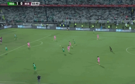 第55分钟,梅西弧顶处兜射击中立柱,苏亚雷斯补射破门,迈阿密国际1-1