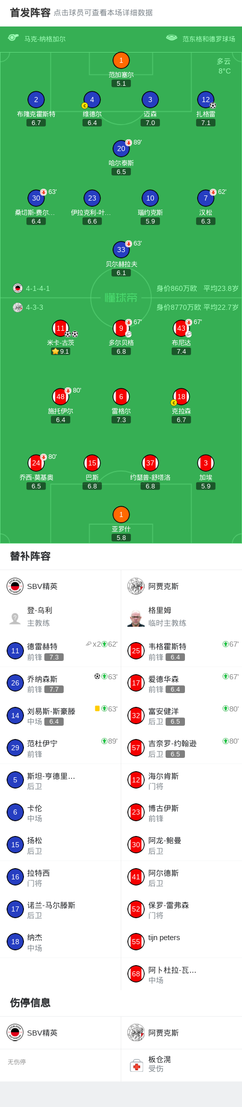第40分钟,阿贾克斯球员多尔贝格助攻米卡-古茨打入一球。