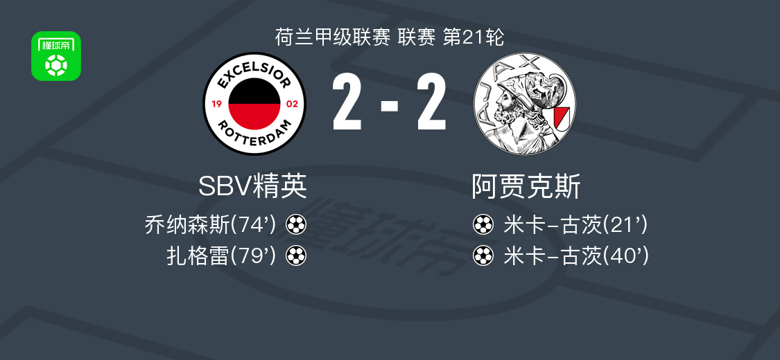 北京时间2月1日荷兰甲级联赛 联赛 第21轮,SBV精英主场对阵阿贾克斯。SBV精英乔纳森斯破门,扎格雷破门。阿贾克斯米卡-古茨梅开二度。最终比分SBV精英 2–2 阿贾克斯。