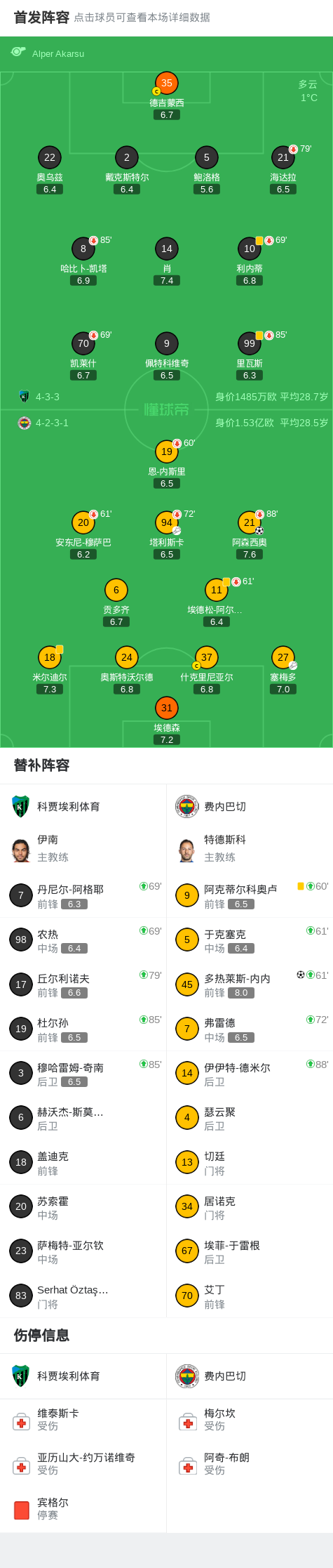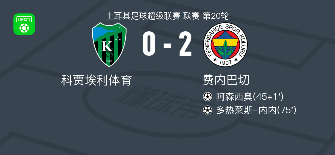 北京时间2月3日土耳其足球超级联赛 联赛 第20轮,科贾埃利体育主场对阵费内巴切。费内巴切阿森西奥破门,多热莱斯-内内破门。最终比分科贾埃利体育 0–2 费内巴切。