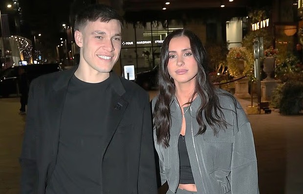 拉门斯身穿卡哈特夹克和宽松的蓝色牛仔裤,牵着女友的手,面带灿烂的笑容走出了餐厅,乌加特看起来也十分轻松自在,他与英国网红乔治亚-梅-希思一起,两人于去年7月公开了恋情。