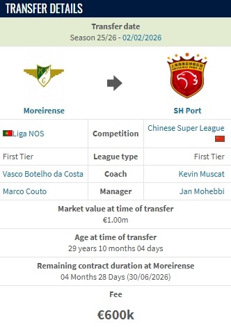 德转显示,莫雷拉人边锋加布里埃尔加盟上海海港的转会费为60万欧。