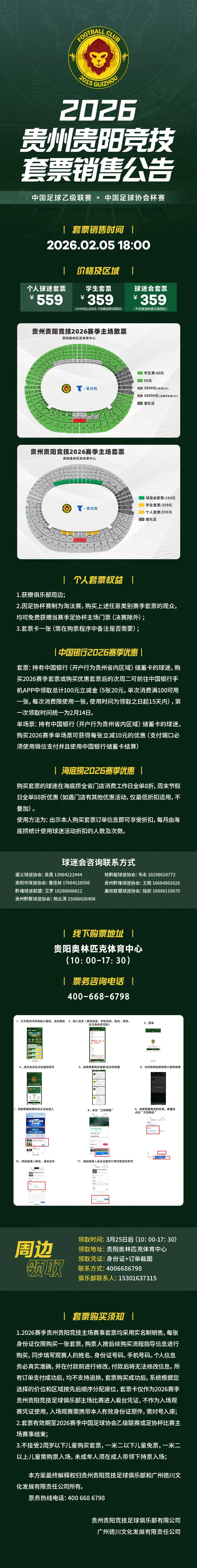 北京时间2月4日,贵州贵阳竞技公布2026赛季主场票价,单场50元,个人套票559元。