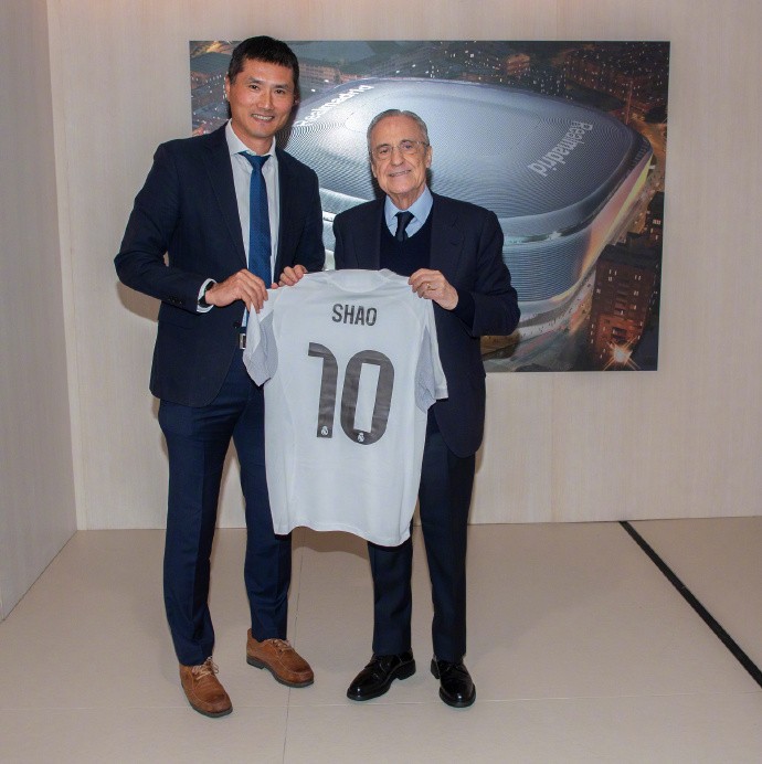 主席弗洛伦蒂诺-佩雷斯先生与邵佳一教练亲切会面并互赠球衣。邵佳一先生参观了皇马体育城,观摩了青年队训练,并与体能教练平图斯、医疗总监尼科-米希奇博士进行了专业交流。