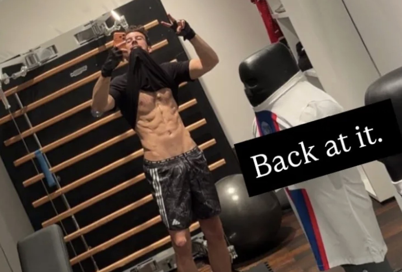 在该社媒的配图中,格雷茨卡展示了自己强健的肌肉,特别是他明显的腹肌。