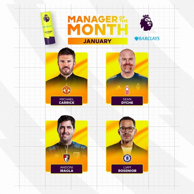 北京时间2月5日,英超官方公布了1月最佳主教练的候选名单,其中曼联主帅卡里克、森林主帅戴奇、伯恩茅斯主帅伊劳拉、切尔西主帅罗塞尼尔在列。