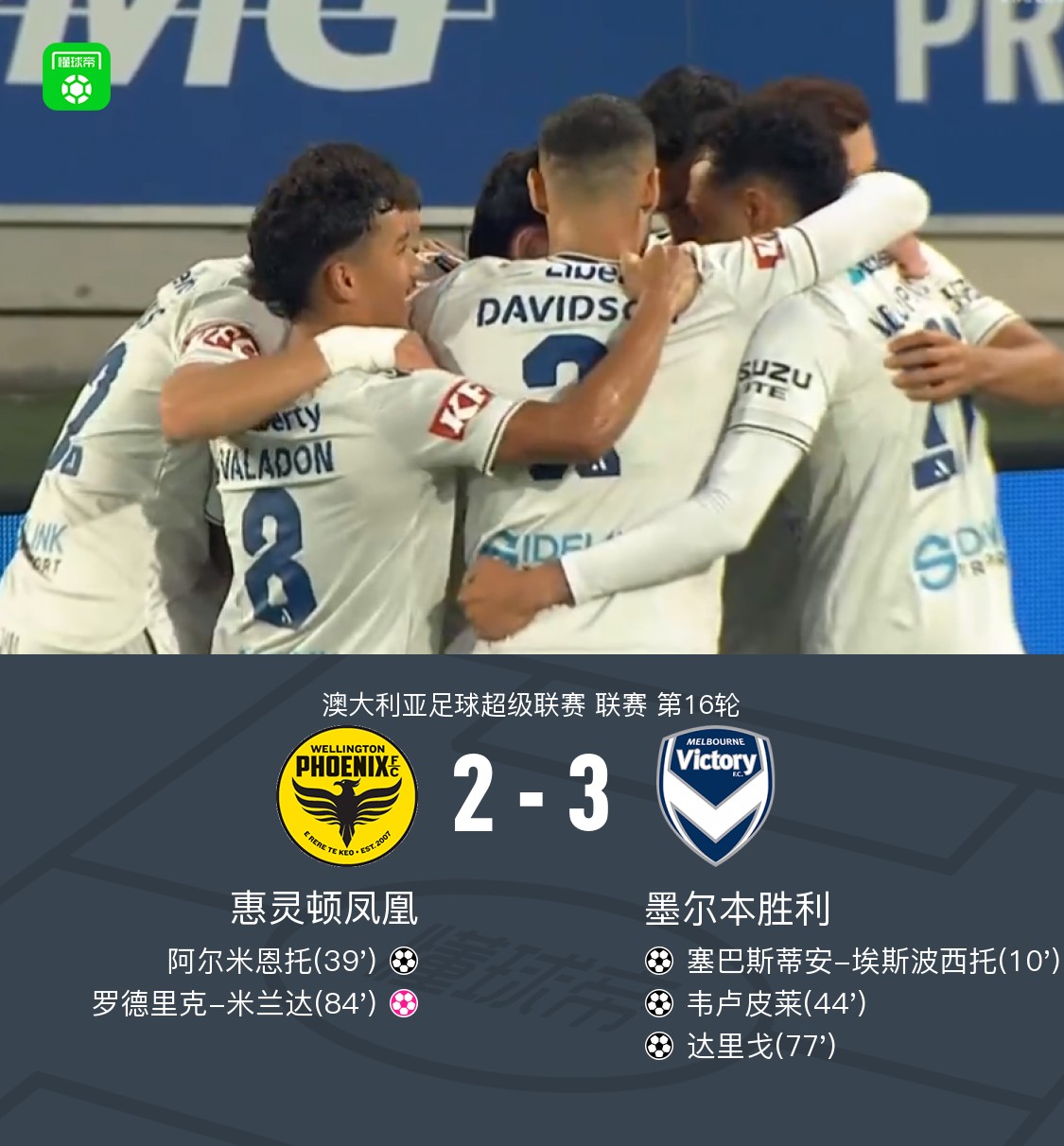 北京时间2月6日澳大利亚足球超级联赛第16轮,惠灵顿凤凰主场对阵墨尔本胜利。比赛中,墨尔本胜利球员埃斯波西托率先取得进球,随后阿尔米恩托扳平比分;韦卢皮莱再次进球领先,之后达里戈又打入一球扩大优势;比赛尾声阶段,墨尔本胜利球员米兰达自摆乌龙,惠灵顿凤凰缩小差距。最终比分惠灵顿凤凰2-3墨尔本胜利。