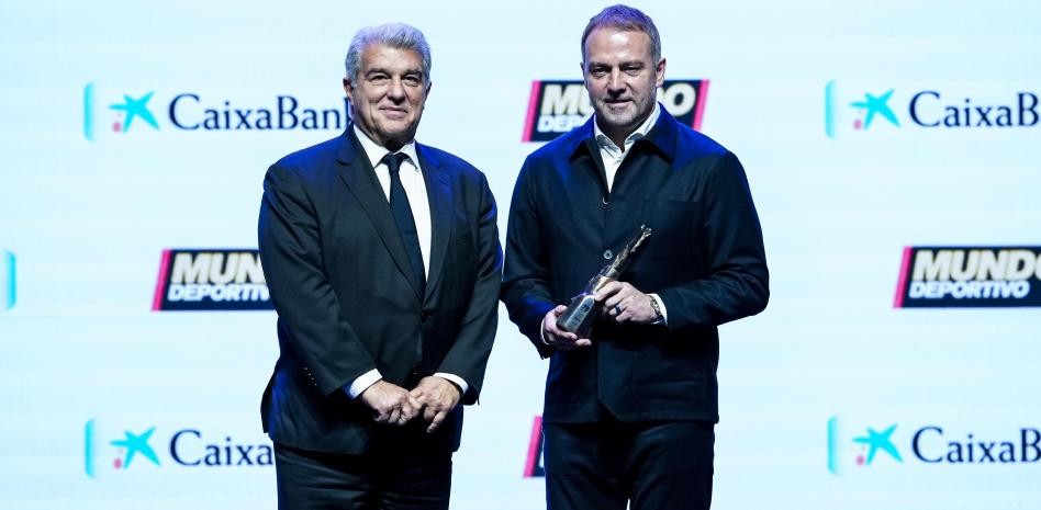 拉波尔塔在第78届《世界体育报》年度颁奖典礼上,为弗里克颁发了奖杯。