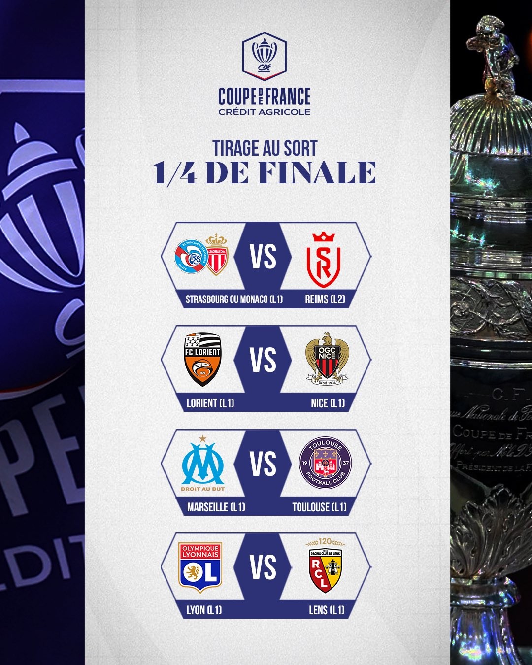 2025/26赛季法国杯进行了1/4决赛的抽签仪式,八强对阵由此出炉。