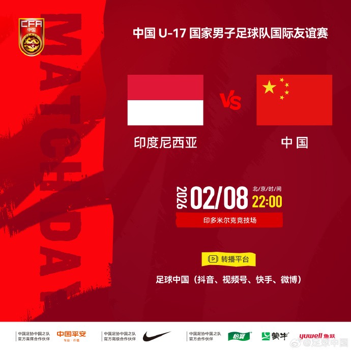 U17国少vs印尼U17的转播平台为足球中国官方账号(抖音、视频号、快手、微博)。比赛时间为2月8日22:00。赛程显示,两队还将于2月11日再度交手。
