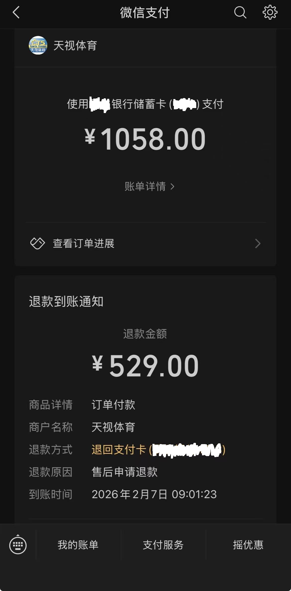 早上抢天津津门虎的球衣,支付成功以后高兴了还没1分钟,系统就自动给我退款了S号的那件(图2)。只有XXXL那件支付成功了。