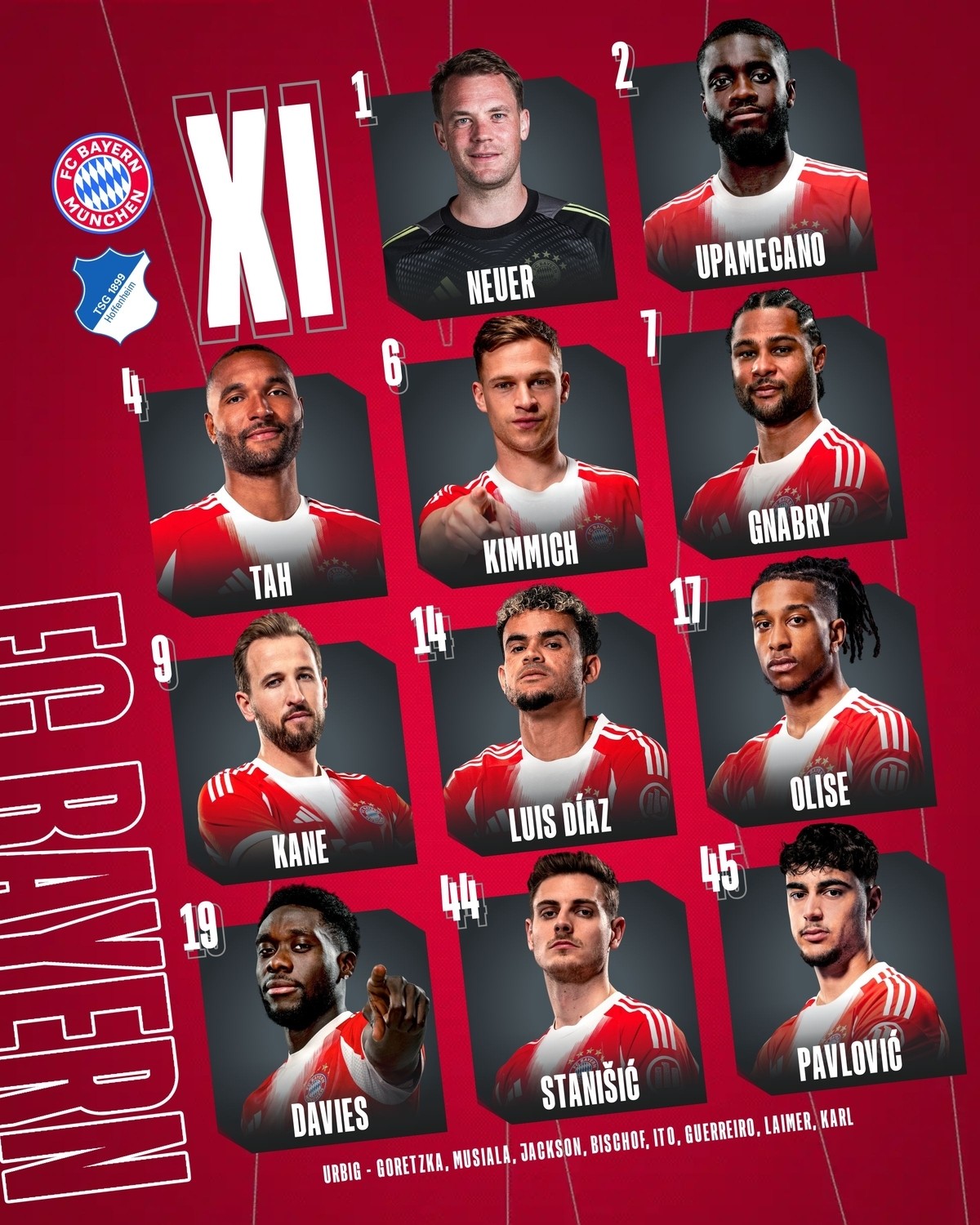 拜仁首发:1-诺伊尔、19-阿方索-戴维斯、2-于帕梅卡诺、4-约纳坦-塔、44-斯塔尼希奇、6-基米希、45-帕夫洛维奇、7-格纳布里14-迪亚斯、17-奥利塞、9-凯恩