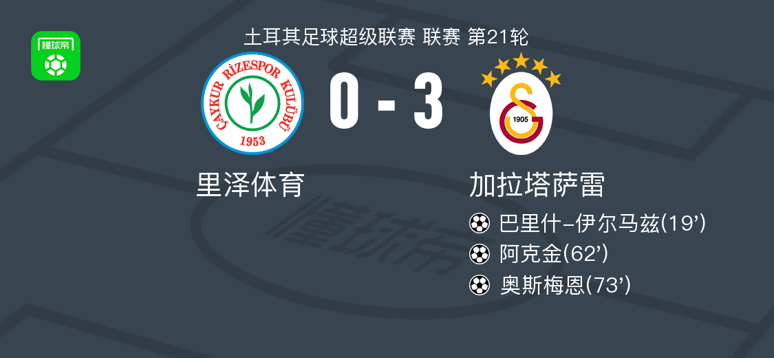 北京时间2月8日土耳其足球超级联赛 联赛 第21轮,里泽体育主场对阵加拉塔萨雷。加拉塔萨雷巴里什-伊尔马兹破门,阿克金破门,奥斯梅恩破门。最终比分里泽体育 0–3 加拉塔萨雷。