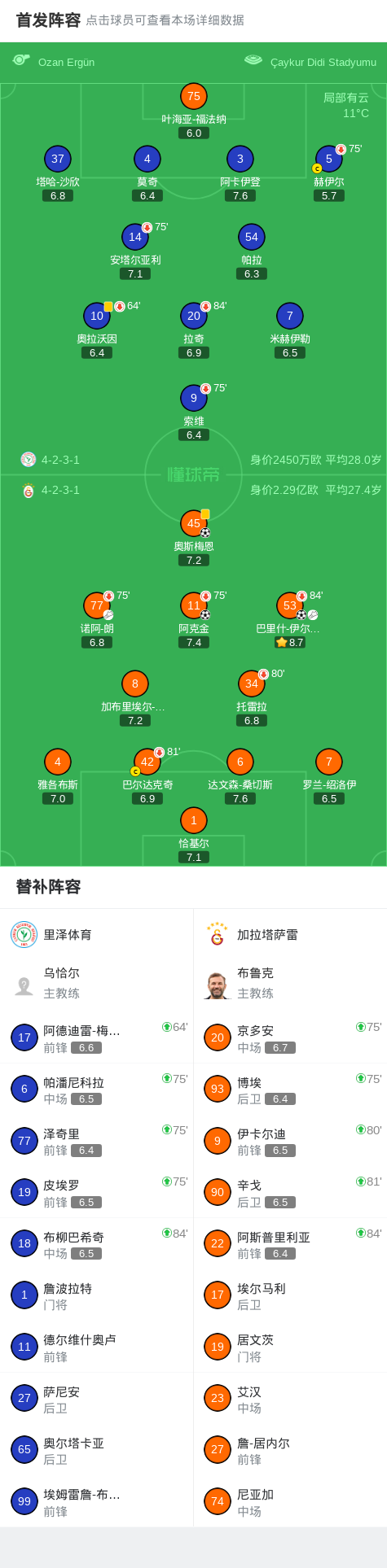第19分钟,加拉塔萨雷球员诺阿-朗助攻巴里什-伊尔马兹打入一球。