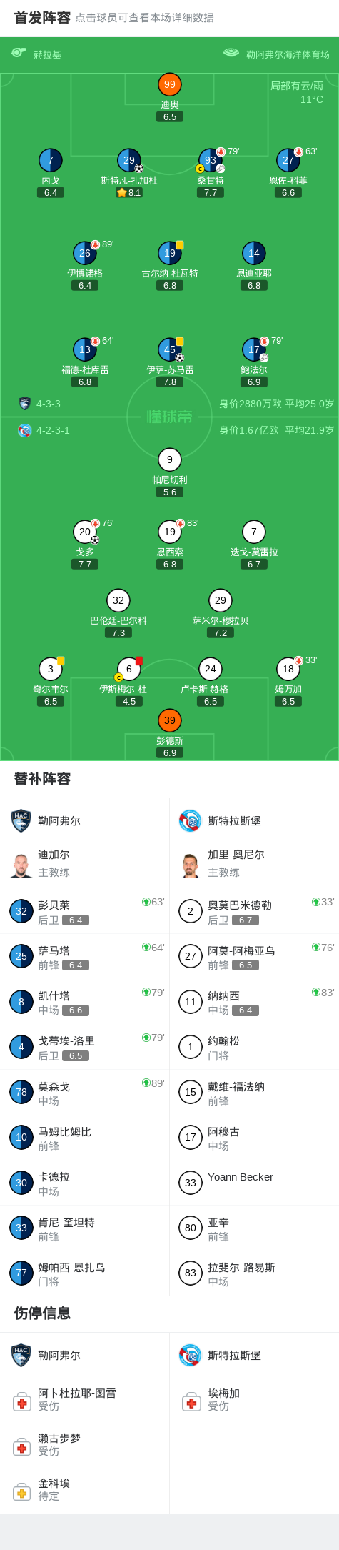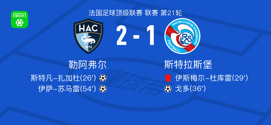 北京时间2月9日法国足球顶级联赛第21轮,勒阿弗尔主场对阵斯特拉斯堡。比赛中,勒阿弗尔球员通过配合由斯特凡-扎加杜率先破门;随后斯特拉斯堡一名球员因犯规被罚下;斯特拉斯堡随后由戈多扳平比分;下半场勒阿弗尔再次通过配合由伊萨-苏马雷打入制胜球。最终比分勒阿弗尔2-1斯特拉斯堡。