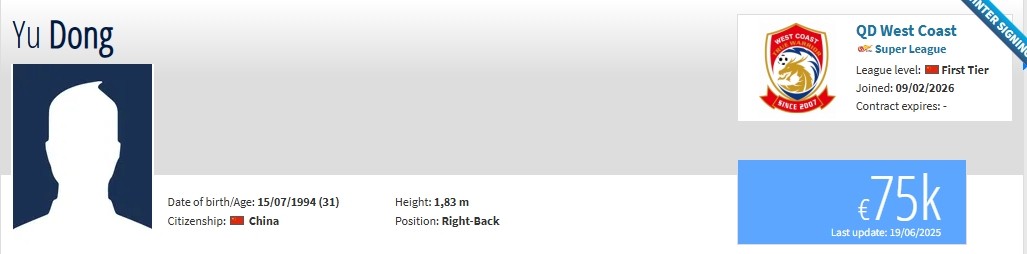 北京时间2月9日,德转更新,原浙江队后卫董宇加盟青岛西海岸。