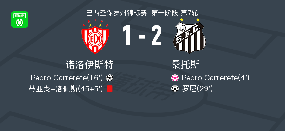 北京时间2月9日巴西圣保罗州锦标赛 第一阶段 第7轮,诺洛伊斯特对阵桑托斯。诺洛伊斯特Pedro Carrerete破门,Pedro Carrerete自摆乌龙。桑托斯罗尼破门。最终比分诺洛伊斯特 1–2 桑托斯。