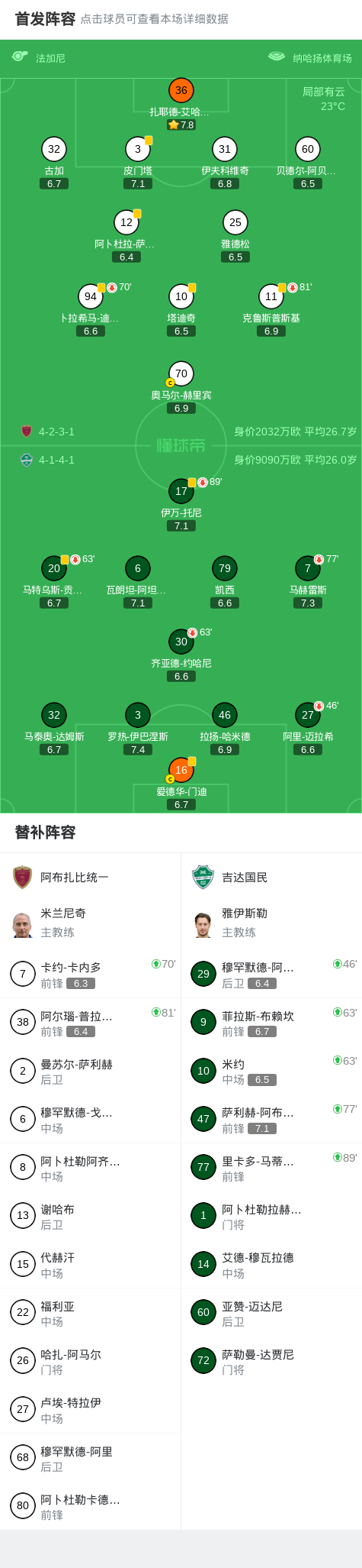 北京时间2月9日亚足联冠军精英联赛 联赛阶段 第7轮,阿布扎比统一对阵吉达国民。最终比分阿布扎比统一 0–0 吉达国民。