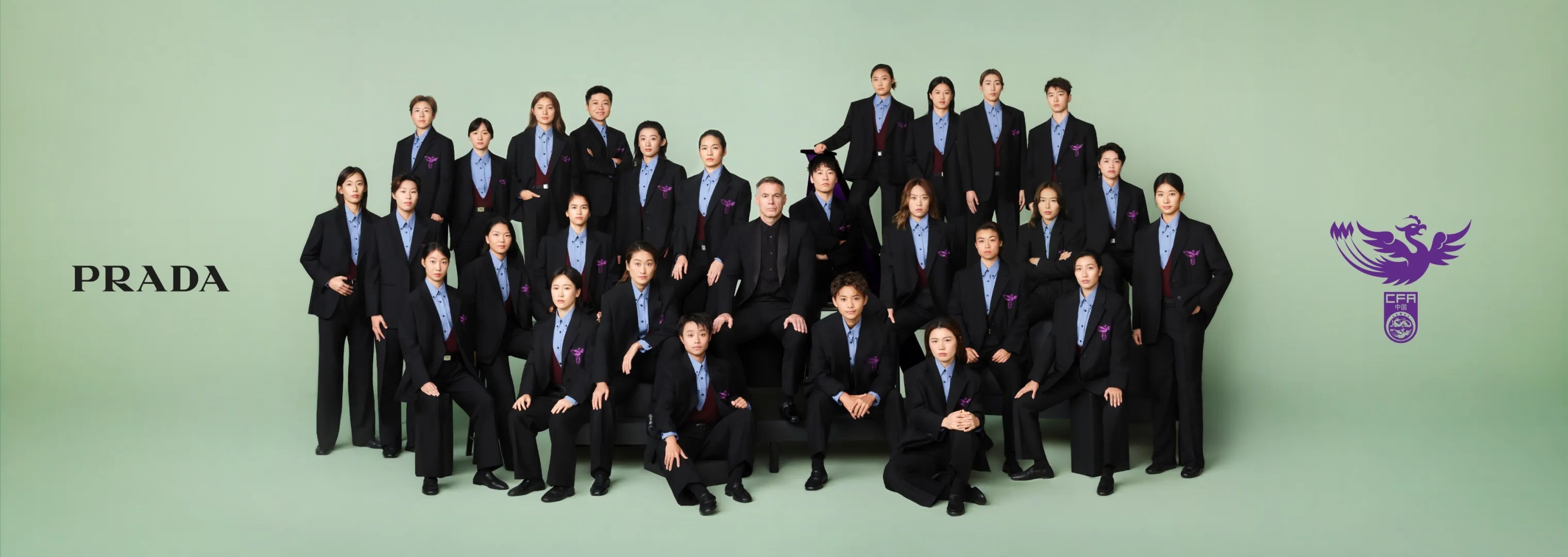 这套全新制服重新诠释了中国女足“铿锵玫瑰”的形象:黑色马海毛定制套装利落有型,上衣绣有紫色凤标的中国女足国家队队徽,内搭蓝色棉质衬衫及以Prada 2026春夏女装系列为灵感设计的红色羊绒针织上衣,并搭配黑色皮质乐福鞋。此次群像大片聚焦新一代兼具卓越表现与拼搏精神的女足队员,呈现她们无所畏惧、迎难而上的团队风貌,与赤马所象征的活力、激情、勇气与独立精神相契合,凝练呈现中国之队与Prada共同的品牌内核。