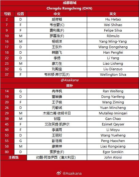 成都vs武里南联:韦世豪、胡荷韬首发,韦林顿-席尔瓦迎首秀