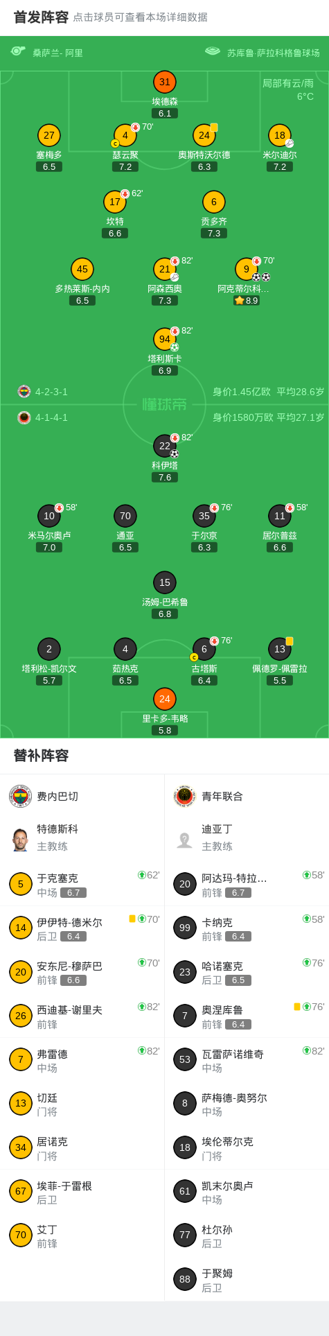 第33分钟,费内巴切球员米尔迪尔助攻阿克蒂尔科奥卢打入一球。