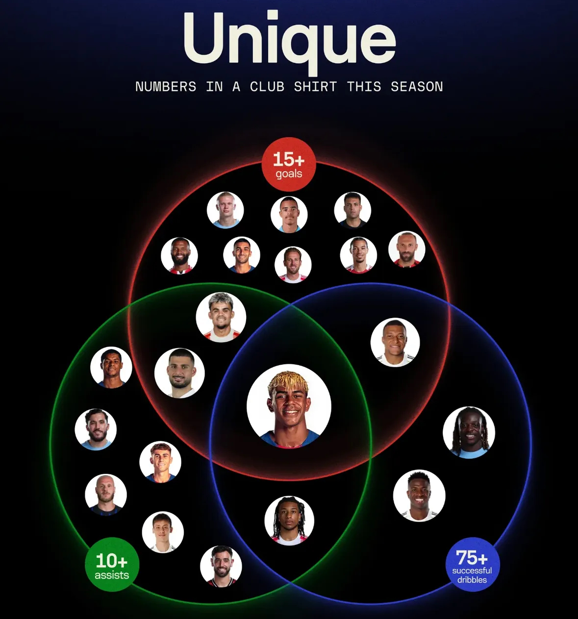 进球超过15次,助攻超过10次,过人超过75次,只有亚马尔目前达到了!