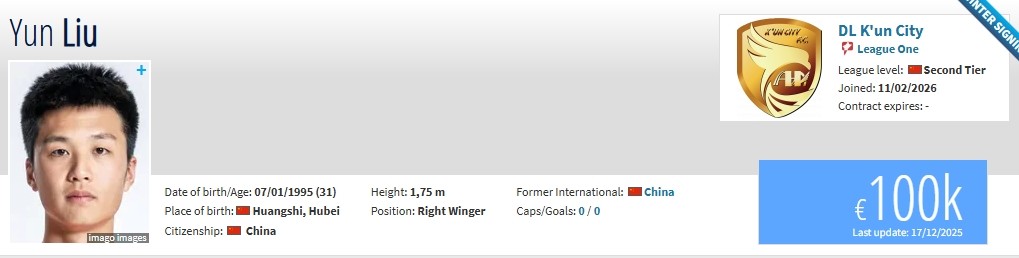 北京时间2月11日,德转更新,刘云加盟大连鲲城,球员上赛季效力于梅州客家。