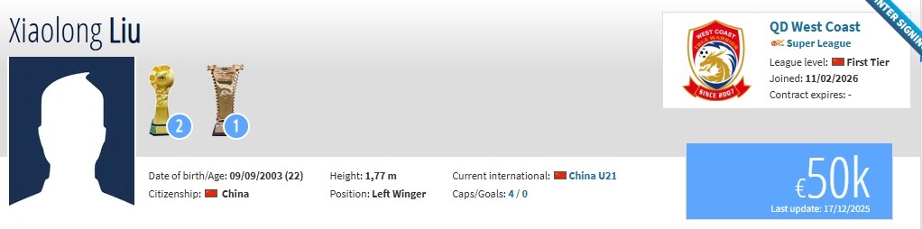 北京时间2月11日,德转更新,彭欣力、刘小龙加盟西海岸。