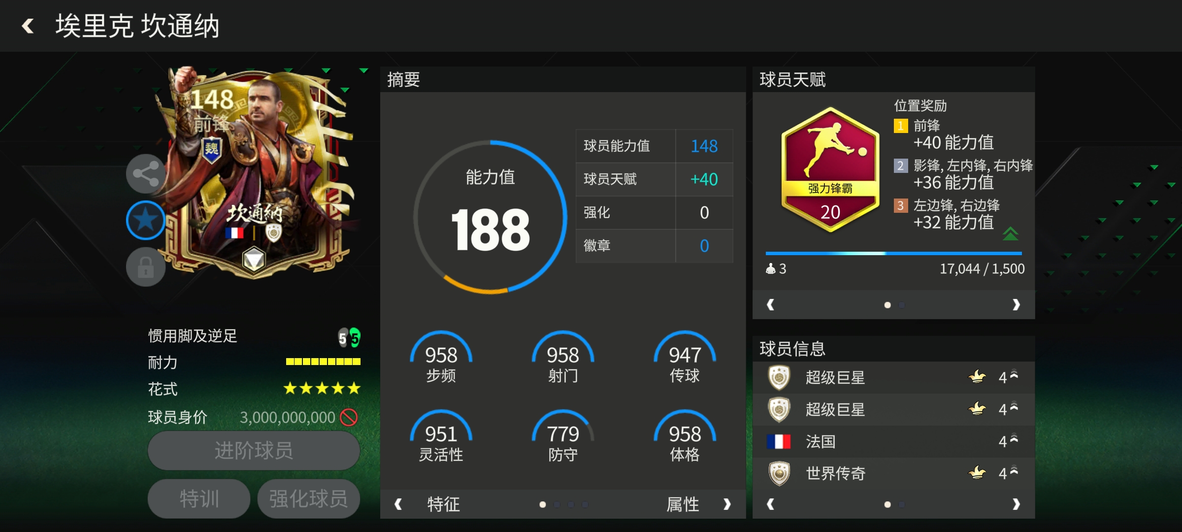 曼联90年代复兴的核心人物之一,坎通纳出生于1966年。游戏中,三国·群雄逐鹿坎通纳配备了强力锋霸天赋,对他的终结能力和加速都有提升。花式方面,高级油炸丸子搭配五星花式星级让身材高大的坎通纳拥有了稳定的持球能力。