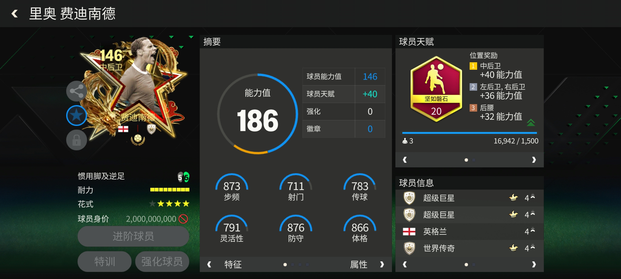费迪南德出生于1978年,这位英格兰足坛最伟大的中后卫曾在曼联取得了辉煌成就。游戏中,冬日绿茵场费迪南德配备了坚如磐石天赋,对他的多项防守数据提升显著。马赛回旋搭配四星花式星级也让费迪南德拥有了出色的后场摆脱能力。