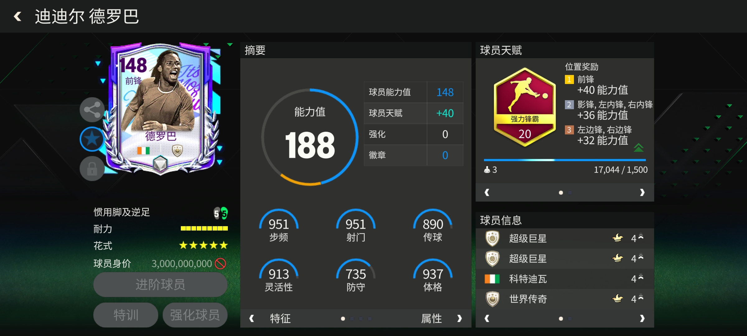科特迪瓦传奇德罗巴出生于1978年,强悍的终结能力和顶级的对抗为他赢得了“魔兽”美誉。游戏中,冬季英超活动中推出的德罗巴配备了强力锋霸天赋,对他的终结能力提升显著。花式方面,五星花式星级搭配马赛回旋的配置也非常出色